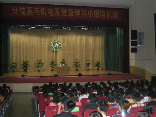 11月18日,计信系与机电系学生学习党章培训班在大礼堂开班。参加培训的对象是写了入党申请书的07级新同学。