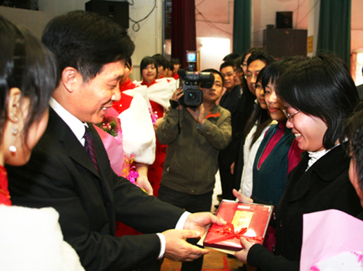 会议首先举行2007年度学院“十大工作创新奖”及2007年度“校园教工十佳”颁奖仪式。学术副院长程发良教授、党委副书记朱冰同志分别宣读学院的表彰决定,院领导分别为获奖项目、获奖者颁发了荣誉证书和奖金。获奖者手捧鲜花与奖状,接受全体教职工的祝贺。