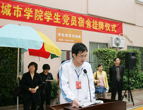 仪式上,朱冰副书记对此次挂牌的党员宿舍的同学提出了两点希望:第一,学生党员们要严格自律,成为学习和生活上的标兵,真正做到“一名党员一面旗帜”,为构建和谐校园和服务东莞地方经济作出贡献;第二,小小的“牌匾”既光荣,又象征着一份责任与义务,希望党员同学们要变压力为动力,积极树立党员意识,时时处处起模范表率作用,为同学们营造一个健康和谐的良好氛围。