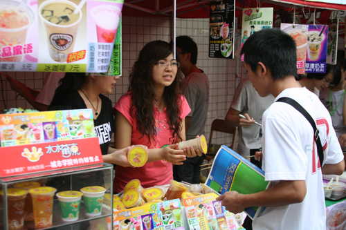 和我们常在电视上见到的拍卖场面一样,竞投现场异常火爆。百余名师生集聚一堂,投标声此起彼伏,为自己心仪中的摊位不断亮牌出价。经过激烈的竞争,所有铺位全部竞投一空,最低价的摊位也要160元。