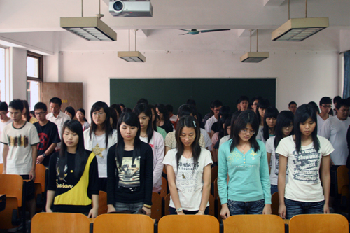 5月19日下午2点28分,天沉沉,雨纷纷。校园里朗朗的读书声暂停了,平日的欢声笑语也停止了。全院师生肃穆地站立,怀着悲痛的心情,以默哀的方式向在汶川地震中不幸遇难的同胞表达哀思。