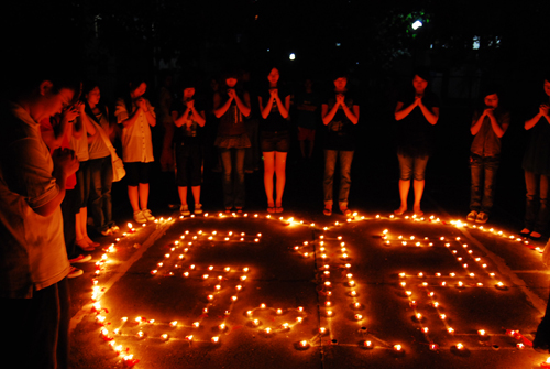 许多同学捧着点燃了的红色小蜡烛,围在一个用红色小蜡烛摆成的爱心图案的周围,共同唱着《祈祷》和《明天会更好》的歌曲,沉痛哀悼震灾中的死难者,表达大家对四川同胞的祝福与希望。
