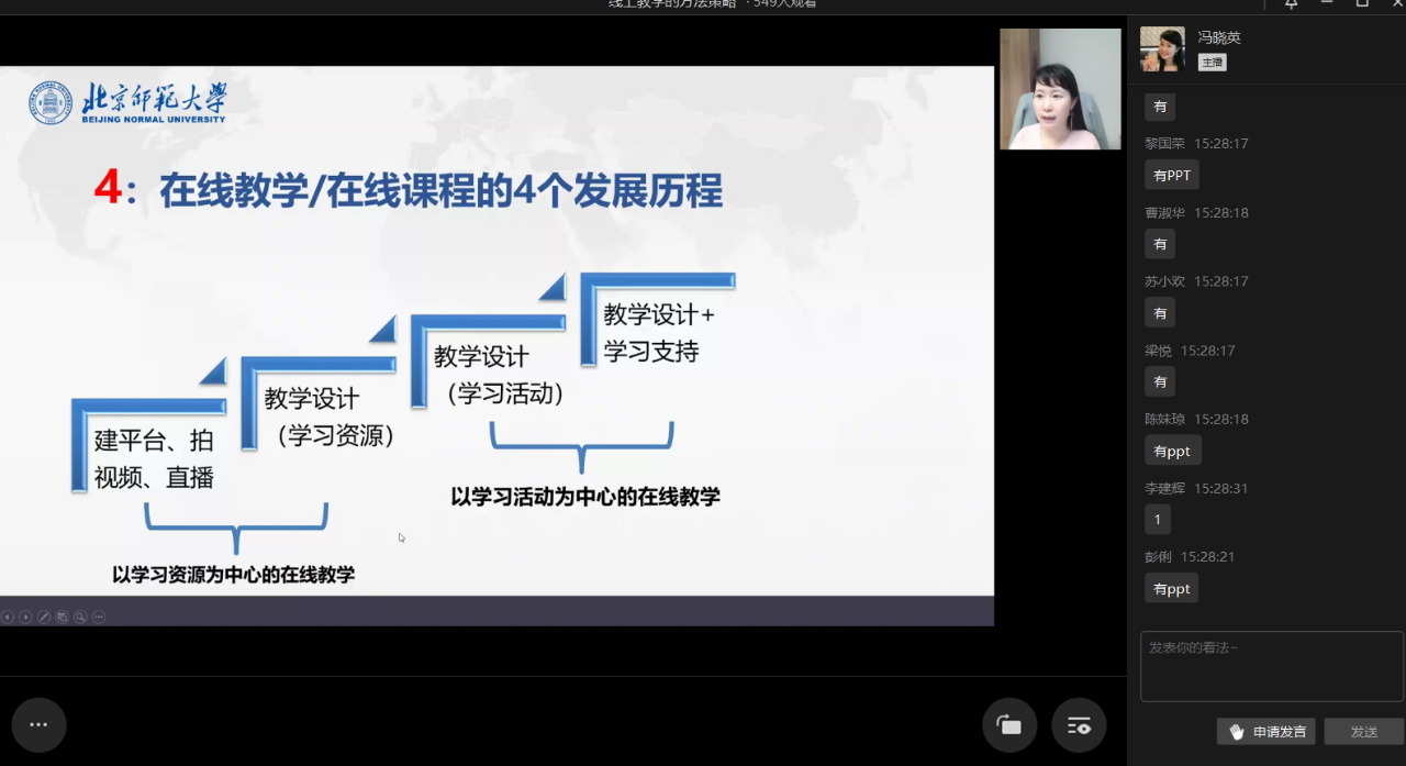 如何设计在线课程?线上教学如何实施?如何把控和提升在线学习效果?这些是教师在实施线上教学中迫切的有效教学策略的核心需求。冯教授从理论基础、关键策略、案例分析三个方面介绍有效开展在线教学的方法策略;以“互联网+”时代混合式学习设计的设计原则,指出教师应通过设计视角、设计理念和设计范畴的转变,以核心目标设计、学习体验设计和学习支架设计为关键点,做出有灵魂的混合式学习设计。其次,结合实际案例,围绕参会教师在混合式教学中最关心的问题开展详细而系统化的讲解;通过教学活动目的、 典型教学活动类型等方面,具体讲解了以活动为中心的高质量混合式教学在初期、中期和后期的设计。最后,针对混合式教学的难点、重点,结合参训教师提出的疑惑,冯教授分享了自己的看法,让老师掌握了高质量混合式教学的关键策略。