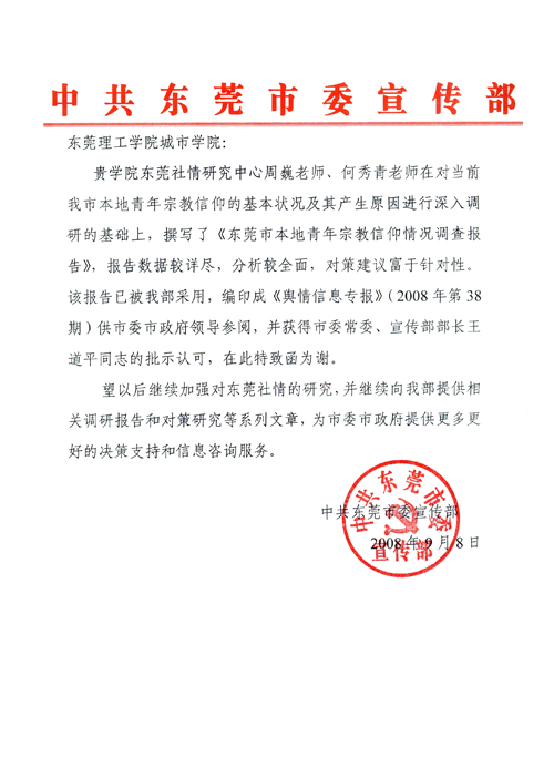 此报告以详实客观的数据,运用科学严谨的分析方法,反映了东莞市本地青年宗教信仰的一些问题,引起了市委宣传部的高度重视。市委常委、市委宣传部部长王道平同志对报告做出了批示:此调查对我们了解掌握当代青年思想情况提供了一些数据,希望多提供一些当代社会不同社会阶层思想情况调查以便参阅掌握。