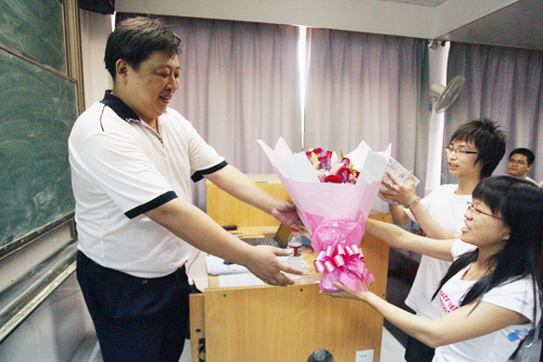 9月10日,计算机与信息科学系05级电子信息工程专业的两名同学走上讲台,一人手捧着鲜花,一人拿着礼物,一起献给了EDA技术基础专业课程的教师李洪超博士。顿时台下100多名学生起立齐声高喊:“李老师,您辛苦了,祝你教师节快乐!”李老师接过鲜花激动地说:“谢谢同学们!感谢同学们陪我一起度过了我的第一个教师节。”