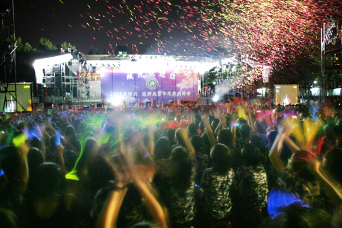 9月25日晚,当学院庆国庆、迎新生军民联欢晚会进行到九时整的时候,现场视频切换,3000多名新生共同观看了长征二号F型运载火箭点火、神舟七号飞船在酒泉卫星发射中心升空的电视新闻。学员身着蓝色迷彩服,排成整齐划一的队伍坐在操场上,有的挥舞着手中的荧光棒,有的挥动着国旗和条幅,热烈庆祝神七飞天的胜利。