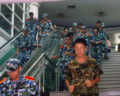 这是城市学院2008级新生军训的一项新课程——“地震疏散逃生”演习。演习中,学生们在老师的指挥下,迅速而又有序地从各个疏散通道紧急撤离,有的同学双手抱头,有的弓下腰降低自己的身体重心。饭堂的1700余名学生和大礼堂的1200余名学生分别在1分01秒和2分30秒后安全撤离到空旷地带,疏散过程中没有发生拥挤、推搡现象,无一人受伤。