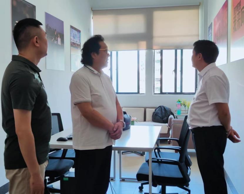 在仪式开始前,方伟华执行校长、张征院长和张宏渝书记共同与曾子鸽老师、工作室同学们一起参观影视工作室的新环境。