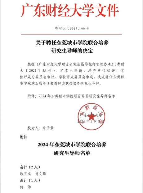7月8日,广东财经大学正式行文,聘任我校会计与金融学院副院长肖文锋教授、国家一流会计专业负责人耿玉成副教授为会计专业联合培养研究生导师,聘任创意设计学院院长何帅博士为设计专业联合培养研究生导师。这是我校继与暨南大学开展联合培养研究生工作以来的又一重大进展,标志着我校学科建设正在稳步向前推进。