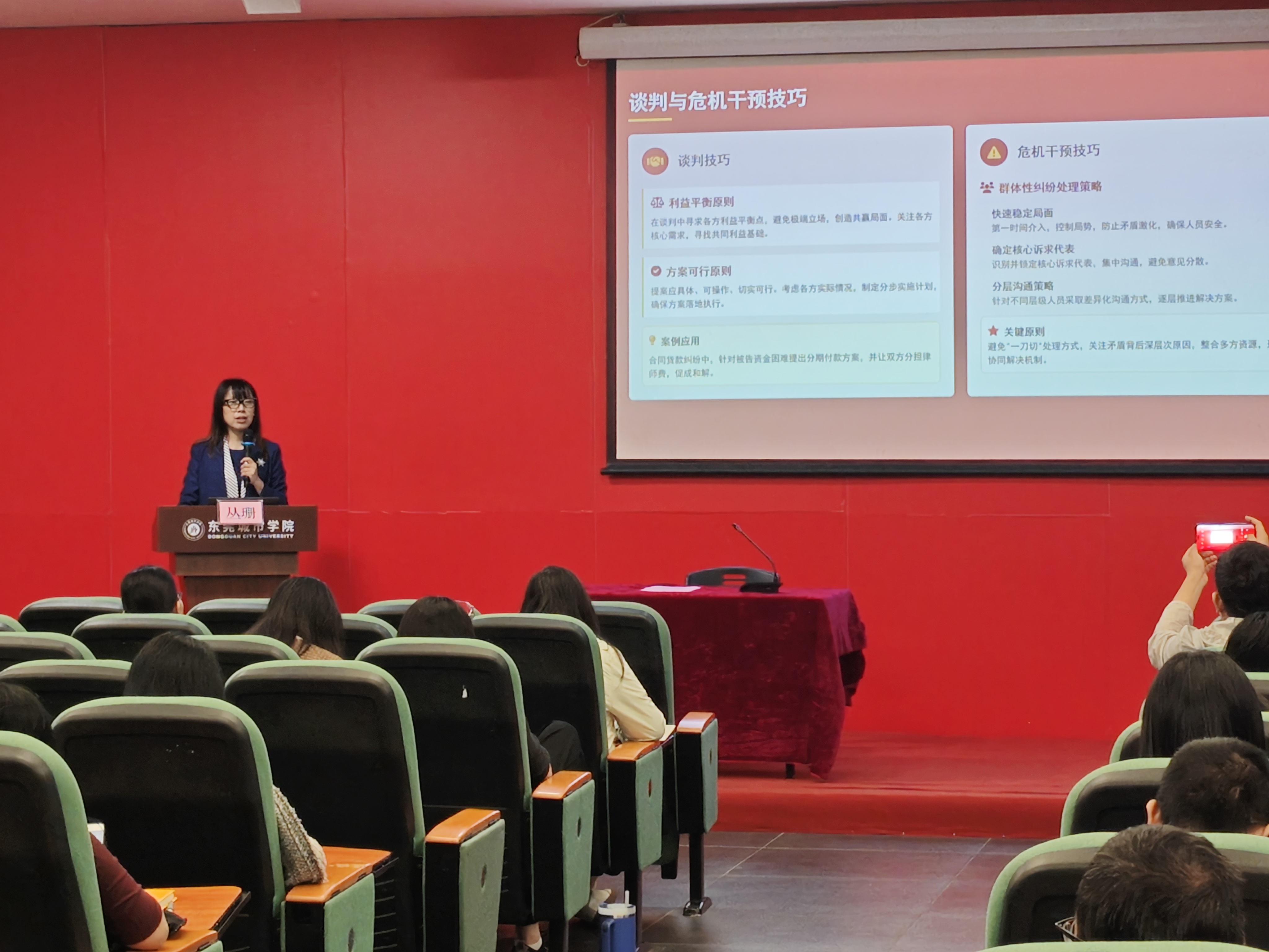 为进一步提升东莞市社会工作督导人才运用专业方法预防、化解矛盾纠纷的能力,10月28日至29日,“社会工作介入矛盾纠纷化解专题培训班”在我校行政楼112会议室顺利举行。本次培训由东莞市委社会工作部指导、东莞市社会工作协会主办、我校法学院承办,吸引近150名东莞市社会工作督导人才及我校师生参与,是校地协同服务地方社会发展的重要实践。