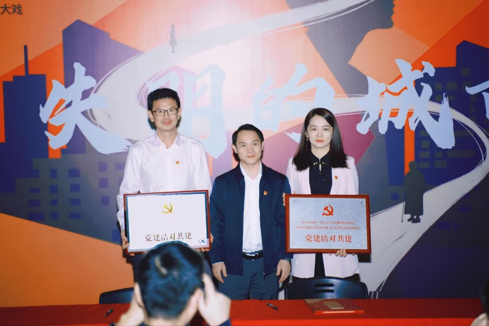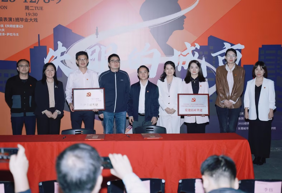 仪式圆满落幕之后,文化交流环节温情启幕。两院师生共同欣赏了东莞城市学院新传媒与艺术学院表演系毕业大戏《失明的城市》。精彩的剧情演绎、扎实的专业功底,不仅是同学们学业成果的集中汇报,更生动展现了“党建+艺术实践”的育人成效,践行了二十届四中全会“丰富文化供给、弘扬社会主义核心价值观”的要求,为校际文化交流写下了浓墨重彩的一笔。演出结束后,两校师生围绕剧本创作、艺术表达、文化传播等主题展开深入研讨,碰撞思想火花,深化了共建合作的内涵。