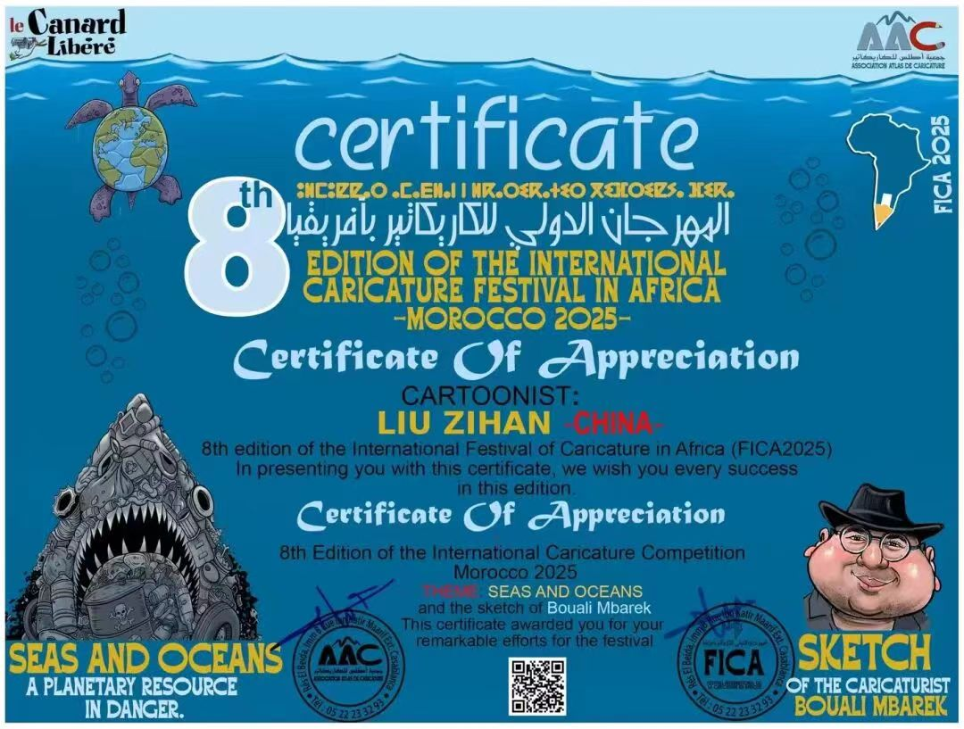 近日,由我校创意设计学院郭冶教授、李佩蒽博士联合指导的刘子涵同学,在“第八届非洲国际漫画节”中脱颖而出,其创作的著名国外漫画家Bouali Mbarek漫画肖像作品,在来自72个国家,1300名艺术家中脱颖而出,刘子涵同学的作品成为72幅展出作品之一!