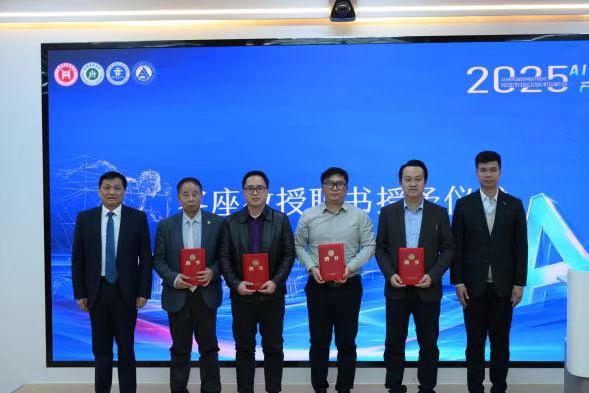 为强化人工智能学科建设,推动产教融合纵深发展,开幕式特别举行了客座教授聘书授予仪式。聘请澳门圣若瑟大学杜文才教授、清华大学深圳研究院李志焕博士、东莞市质量监督检测中心钟海彬博士、深圳优必选科技股份有限公司张铁军总监四位行业专家担任我校客座教授。魏东初书记、方伟华执行校长向四位专家颁发聘书,并代表学校表示,他们的加盟将为我校AI人才培养注入强劲动力,为产教融合搭建更坚实的桥梁。现场嘉宾共同见证了这一重要时刻。