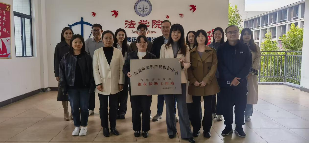 2025 年 12 月 23 日,东莞市知识产权保护中心维权援助工作站总结会议暨知识产权维权援助专题培训在市市场监督管理局(知识产权局)隆重举行。会上,东莞城市学院知识产权维权援助工作站正式成立,作为寮步镇唯一兼具公益服务与科研属性的知识产权专业保护平台,不仅为区域中小微创新企业带来专属权益保障,更搭建起高校法学实证研究与政企实际需求深度对接的科研桥梁。法学院执行院长丛珊博士、维权站站长李奕副教授、核心成员蔡晓青博士、曾芷晴老师组成团队参会,共同见证这一校地协同、研用结合的重要时刻。