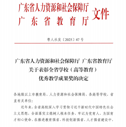 近日,广东省教育厅与省人力资源和社会保障厅联合发布《关于表彰全省学校(高等教育)优秀教学成果奖的决定》。我校在此次评选中表现突出,荣获一等奖1项、二等奖2项,获奖数量与质量均创历史新高,实现了标志性的“双突破”。