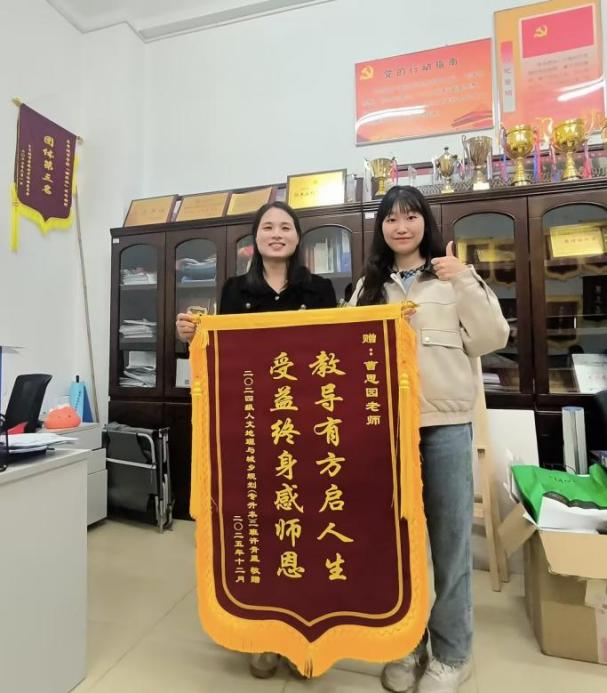 近日,东莞城市学院城建与智造学院出现了一起有趣的画面,2024级人文地理与城乡规划专升本2班的许青星同学为表达老师的帮助,向学校辅导员曹思园赠送了一面锦旗,“教导有方启人生,受益终身感师恩”,12个金色大字闪闪发光,为冬日的风里送来了一股特别的暖意。