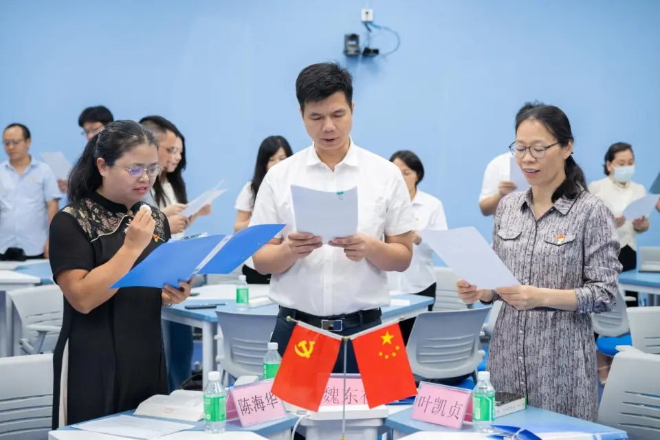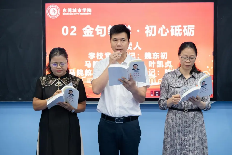 “金句领学・初心砥砺”环节中,学校党委书记魏东初、学院党总支书记叶凯贞、教工第一党支部书记陈海华率先垂范、带头领学,带领全体参会人员共同学习《习近平谈治国理政》(第五卷)第一专题《以中国式现代化全面推进中华民族伟大复兴》中《新征程是充满光荣和梦想的远征》篇目金句,引导大家在逐字逐句诵读中感悟思想伟力、汲取奋进力量。