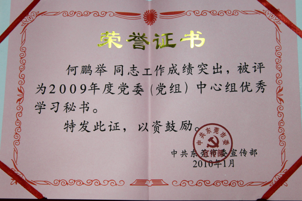 近日,中共东莞市委通报表彰了一批宣传思想工作先进单位、先进个人。我院党委中心组获得表彰,院党委宣传部部长何鹏举荣获2009年度党委(党组)优秀学习秘书。