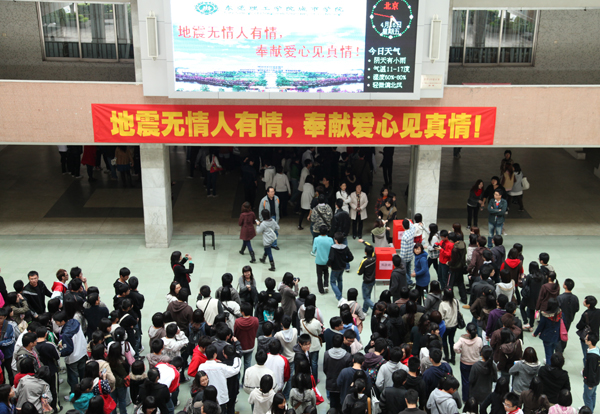 4月16日,四号楼大厅人头攒动,近千名师生聚集在此,为青海玉树地震灾区奉献爱心捐款。这是继云南、贵州旱灾地区捐款后的又一次大规模的捐款行动。