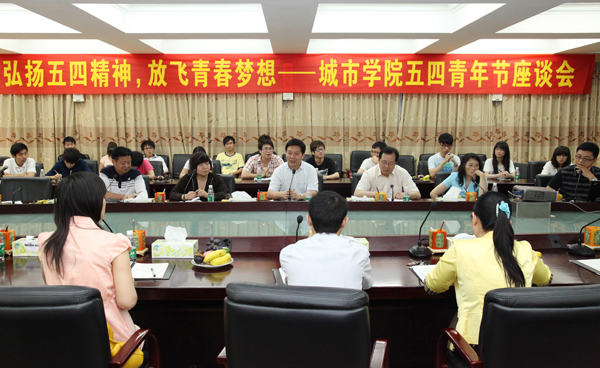 5月4日,由院团委主办的“弘扬五四精神 放飞青春梦想——城市学院五四青年节座谈会”在315会议室举行。