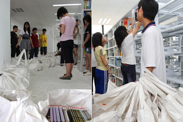5月22、23日,400名学生志愿者与图书信息中心的老师共同努力,将图书馆的大部分书籍搬运到了新馆。尽管时有大雨,但由于准备充分、组织周密,整个搬迁工作始终有条不紊,顺利完成任务。至此,图书馆搬迁工作的关键部份已经完成。