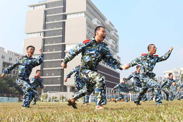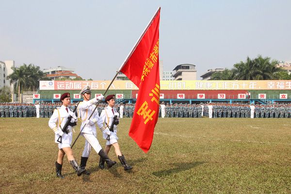 周致纳书记在军训团团长刘丰少校的陪同下检阅受训学员。随后,12个连队方阵迈着整齐划一的步伐,高喊嘹亮的口号,依次通过主席台,接受首长和领导的检阅。军体拳、女子防身操、旗令操等军训课目汇报表演更是激起观众一阵阵雷鸣般的掌声和欢呼声。