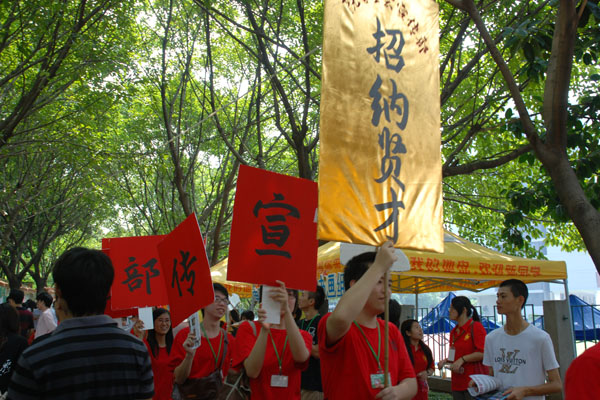 9月28、29日,城市学院各院级学生组织联合招新活动全面展开。院团委、院学生会、大学生记者团、广播站、心理工作委员会等学生组织在校园第一饭堂的校道一字排开,鲜艳的帐篷、整齐的报名桌、各具特色的广告展板、热情的接待人员吸引了众多学生的关注。学生会宣传部部员身穿红色T恤,高举“宣传部欢迎你”的牌子进行宣传,办公室成员拿着喇叭,高喊“小办小办,永远最棒”,大学生记者团广播站的宣传漫画,简单可爱。各部门奇招迭出,吸引新生的眼球。现场前来咨询、报名的学生络绎不绝,往来如织的人群将校道挤得水泄不通。