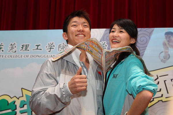 昔日拿奖牌,今日得掌声。11月25日,跳水奥运冠军李娜与世锦赛团体、吊环双料冠军董震参加校运会开幕式后,又来到学术报告厅与大学生们进行了面对面交流。