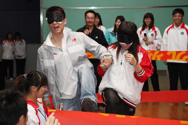 在交流过程中,两位冠军还在学生处陈浩老师和07级文学与传媒系尹嘉蔚同学的主持下,和同学们开展了趣味游戏和互动活动。亲密的接触,轻松的节目,有趣的形式,掀起了一个又一个高潮。