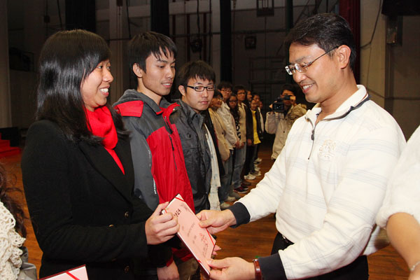 先进班集体代表08国贸2班班主任卢晓晴,获得国家奖学金代表政法系汤文杰同学在会上发表了获奖感言。