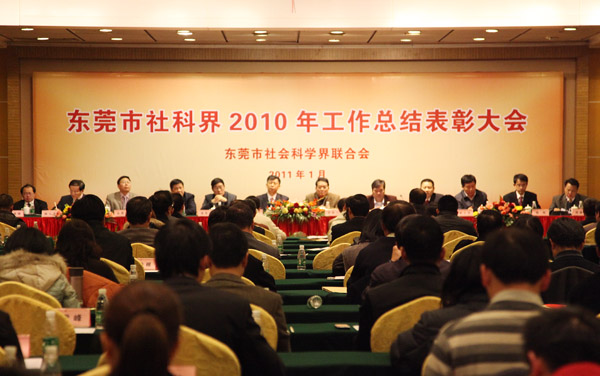 东莞市社会科学界2010年工作总结表彰大会1月6日在东莞会展国际酒店举行。广东省社科联朱新行副书记、省社科院温宪元副院长,中共东莞市委常委、宣传部部长王道平,副市长严小康,东莞市社科联主席王思煜、副主席龙家玘等省、市社科界领导出席了此次会议。我院院长安少华作为市社科联兼职副主席在主席台就座。