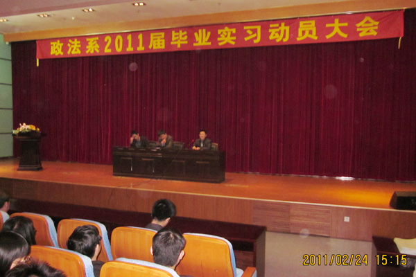为了切实做好实习生的实习指导工作,确保实习生在实习阶段取得成效,引导毕业生树立正确的就业观、择业观,2月24日,政法系在学术报告厅召开2011届毕业生实习动员大会。政法系主任刘杰教授、全系教师及2011届毕业生参加了会议。