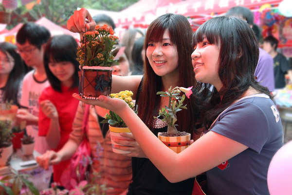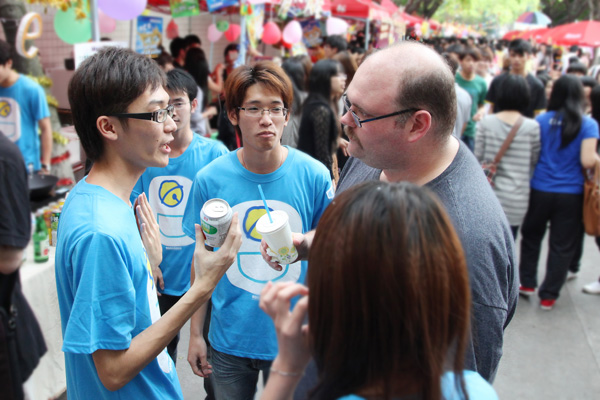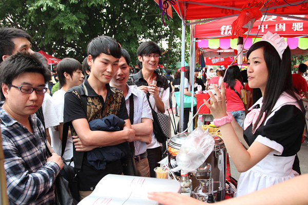 与往年的摊位名号相比,今年的店面招牌更是新颖夺目,“非尝不渴”、“糖心风暴”、“食得好”等店名既好听又创新,当然客源滚滚而来。最具特色的还属效仿日本风的“女仆咖啡屋”,几个女生身穿女佣连衣裙,模样既可爱又甜美,那些喜欢日式“萌女”的男顾客们又怎能挡住她们的魅力?当然是个个都掏钱喝咖啡、看美女去。