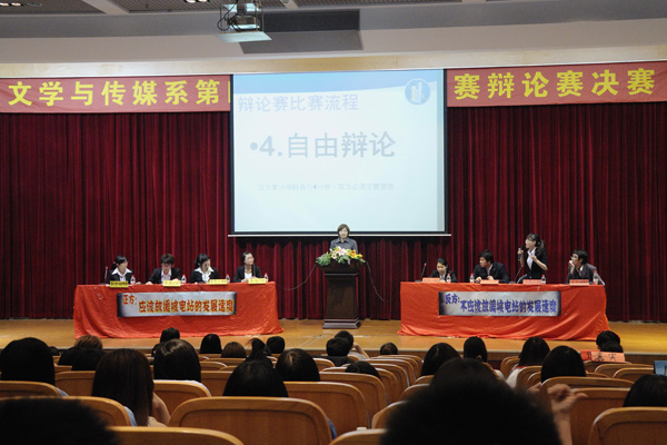 表演赛结束后,2010级新闻传播班和2008级新闻传播班决赛的辩题是 “应不应该放缓核电站的发展速度”。经过几番唇枪舌战,最后,2010新闻班“初生牛犊不怕虎”,击败对手,夺得冠军。