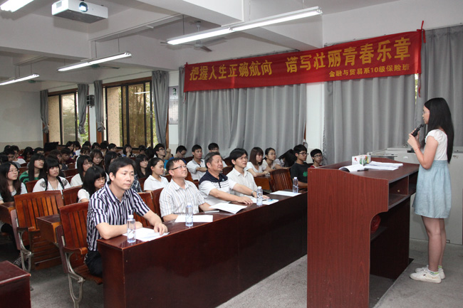 近日,金融与贸易系10级保险本科班在6202课室举行了一场以“把握人生正确航向,谱写壮丽青春乐章--从感恩启程”为主题的班会。院督学陈丁堂教授,思政部主任、党委宣传部部长何鹏举教授,系党总支书记龙卫洋博士应邀出席了班会。