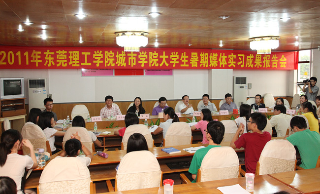 9月9日,我院在4410会议室举行了2011大学生暑期媒体实习成果报告会。党委宣传部部长何鹏举,文学与传媒系主任陈庆祝、党总支书记孟颖,新闻中心的相关指导老师出席了会议。南方都市报东莞站新闻部主任王海军,南方网前沿东莞新闻中心主任陈伟赞,新快报东莞站副主编杨英杰,南方日报东莞站记者吴少敏,信息时报东莞站记者戚莹莹,东莞市壹诺广告策划有限公司总经理、第三届大学生记者团团长张泽勤等应邀出席报告会。