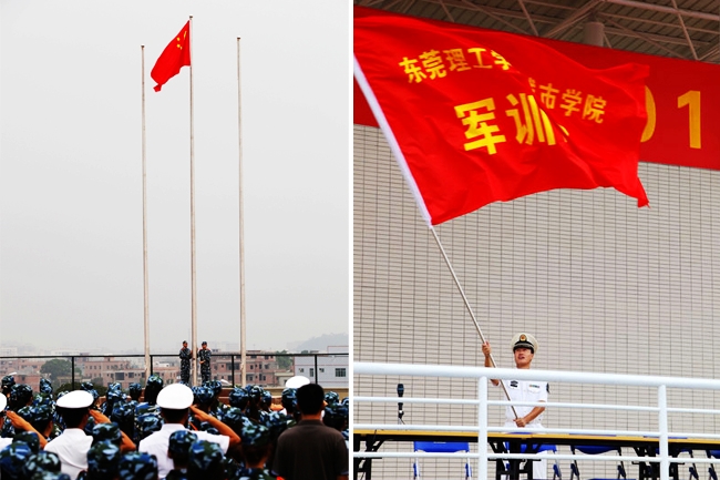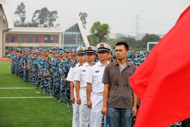 在运动场上,身着崭新军训服装的同学们个个英姿飒爽、士气高昂,分成18个连队整齐地整列在主席台前。8时45分,在一阵热烈的掌声中,来自沙角部队的军训团官兵排着整齐威武的队列进入会场。随后,会场奏响国歌、升起国旗。
