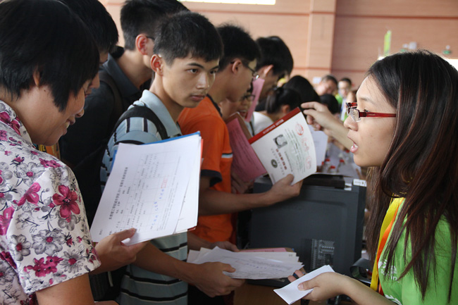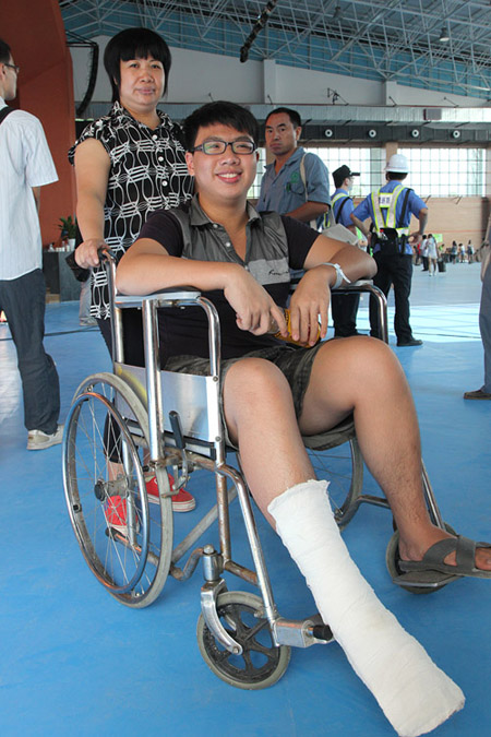 在新生中有一个特别的身影,他坐在轮椅上,由父母推着过来报到。他脸上带着笑容,很享受报到这个美好的过程。他就是录取到计算机与信息科学系的,来自佛山市的伍楚健同学。在入学报到的前几天,他的脚不小心被玻璃割伤,不得不住院治疗。医生要求他住院几天,但是由于今天是入学报到的大日子,所以他坚持让父母推着轮椅送他来报到。伍同学说,大学报到对一个人来说,也许一生就只有一次,他不想错过人生这一重要的时刻,他想亲自感受报道的热闹气氛,想快一点看到自己的大学校园,想尽快接触未来的老师和同学。