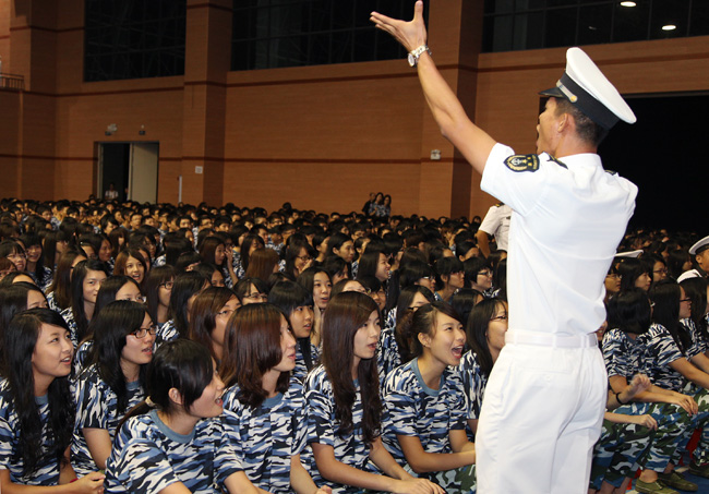 “11连,very good !”。9月20日中午,11连的同学们在训练场上与教官互动口号,并高唱军歌《人民海军向前进》。