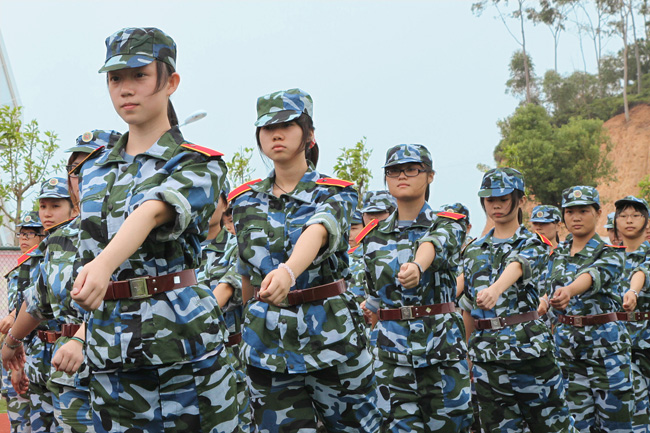 与昨日不同,今天教官们一改“严厉”的训练方式,通过唱军歌、拉歌、讲英语等轻松有趣的训练方式让同学体会现代军人风貌及训练的乐趣。