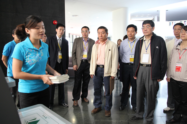 专家们观看工作人员对“自助借还书系统”的演示和介绍。