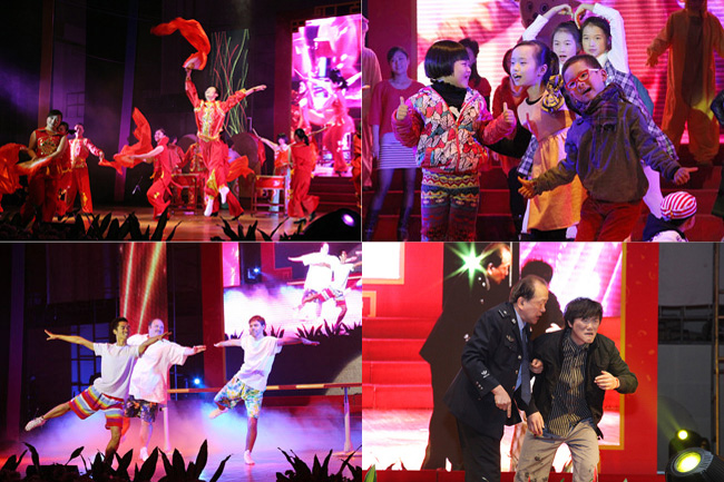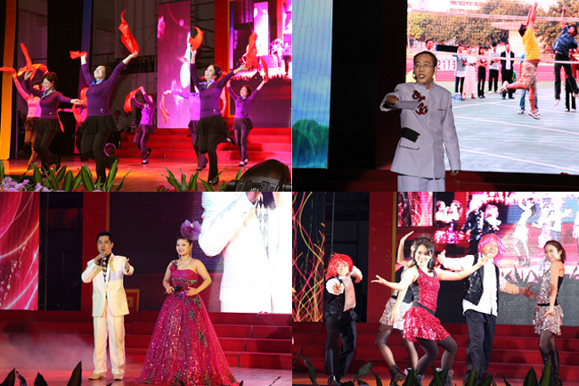 陈建新、陈晓萍等老师表演的鼓舞《龙腾虎跃》,鼓声点点,澎湃激昂,舞者带着热情欢庆过去一年的收获,舞动着崭新的希望,让观众情绪高涨,欢呼雀跃。体育教学部的老师们别出心裁,创作表演了富有城院特色的综艺小品《非雷勿扰》,雷人的造型,一流的反串,雷人的语言,惹得观众捧腹大笑,直呼“真够雷的!”来自天南地北的老师演唱的《歌曲串烧》充分体现了浓郁的地方特色,天籁般的《次仁拉索》把观众带到了美丽的高原,经典的闽南歌曲《爱拼才会赢》道出了城院人拼搏的心声,熟悉的旋律《我的家在东北》、《红日》、《龙飞凤舞迎新春》让观众回味无穷。舞蹈《欢乐芭蕾》讲述了外教老师偷师学艺的有趣故事。《舞蹈串烧》中的中青年教职工各有千秋,风华无限。舞蹈《咱们工人有力量》把朴实勤劳的后勤们展现得淋漓尽致。谭汪洋表演的《城院播报》,教职工及其子女表演的亲子时装秀《爱在城院》可爱温馨,意蕴年轻的城市学院明天会更加美好。