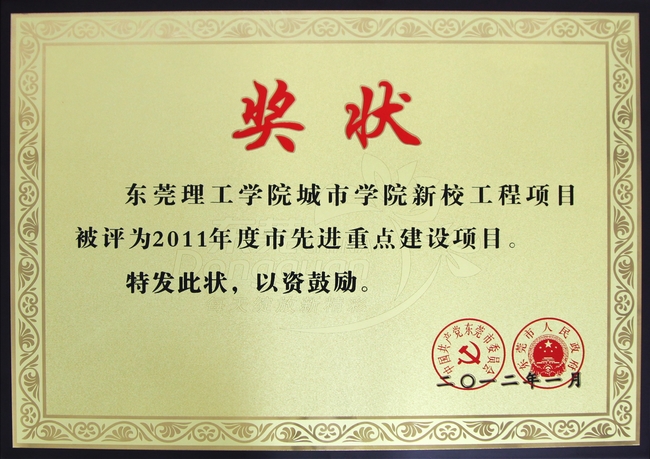 此次我院新校区工程项目被授予“2011年度东莞市先进重点建设项目”荣誉称号,是市委、市政府对东莞理工学院及城市学院和广东鸿发投资集团有限公司,在深入学习、践行科学发展观,为东莞实现 “文化强市”的战略目标、大力发展高等教育事业所做出的突出贡献的肯定;是东莞市实现高水平崛起,继续推进“三重”建设的标杆之一。