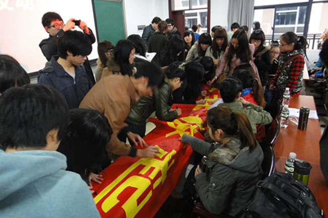 会后,2011级全体同学在印有“学风建设,从我做起,奋发图强,争创一流”的横幅上签名并写下誓言,表示从今天开始,好好学习,为自己的未来努力奋斗,为艺术系争光添彩。