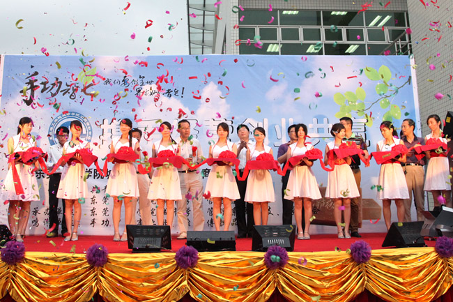 我院第七届工商模拟市场于16日下午5点半在莞城校区第一饭堂广场前举行开幕仪式,管理系主任罗余才教授在开幕式上致辞,宣布莞城校区工模市场正式开市。院党委副书记章德胜、院督学陈丁堂、教务处处长邓成良、学生处副处长陈建新、院团委书记杜鹏举以及副书记罗文芳出席了开幕式并为本届工商模拟市场剪彩。
