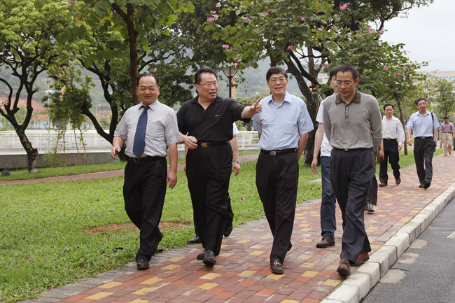 东莞理工学院校长杨晓西,城市学院院长杨敏林陪同来宾参观新校区校园