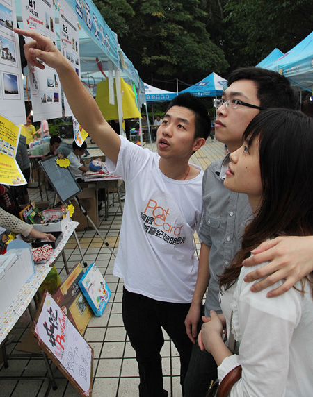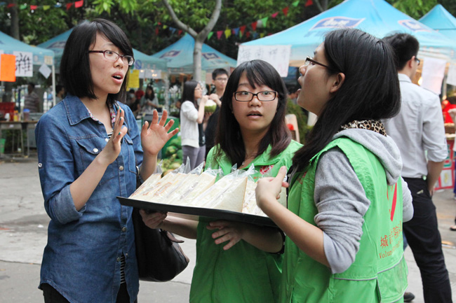明明是摆摊做生意,为何志愿者的标志会挂在摊位前?一番询问下,得知档主是台湾商人,他认为社会是用爱来填充的,无时无刻,我们都可以奉献爱。因此这次工模摆摊,除了自己销售产品外,他专门跟我院的志愿队合作,为我院志愿队提供产品,让志愿队进行义卖。赚取的钱会捐到慈善机构,为社会奉献爱心。所以,在工模的大街小道上,我们会惊奇地看见绿衣天使捧着商品在销售。他们不为多大的利润,只为小小的奉献。
