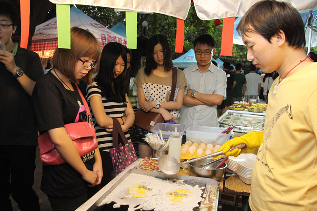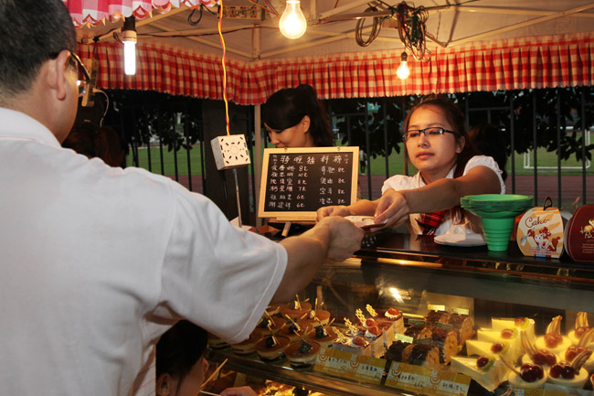 自古美女爱美食,瞧瞧10号摊位前面美女如云,是什么东西这么有吸引力,连美女也倾倒。走近一看,一个个小巧诱人的蛋糕隔着透明橱柜发出热情的邀请。贝菲蛋糕美食的摊主一连推出了20多种口味,添加水果、巧克力、果冻等,造型可人,有谁不心动呢?金贸系的尹同学刚买了一个芝士口味的,刚吃了一口就忍不住夸道:“很赞,甜而不腻,还想再试试其他口味。”