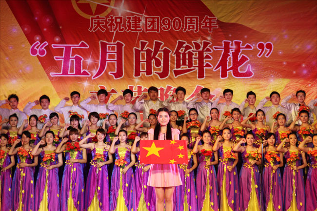 晚会分别以“爱国、进步、民主、科学”四个主题设计。整台晚会,展现了中国共青团建立90周年以来的光辉历程,歌颂了一代又一代优秀共青团员的光荣事迹,引起了现场观众强烈的共鸣。由艺术系师生带来的《解放区的天》、《红梅赞》、《洪湖水浪打浪》等歌舞表演再现了时代的风华,让大家重温那片红色的记忆;《青春的榜样》、《以青春的名义宣誓》等朗诵深情并茂,慷慨激昂,激励大家高举共青团鲜红旗帜,向新的征程奋进;无伴奏小合唱《美丽的草原我的家》、管乐合奏的《好日子》、歌曲《我们的生活充满阳光》歌颂了今天的幸福生活;街舞《致敬》,通俗歌曲《一生有你》、舞蹈《旋、旋、旋》等展现了当代大学生蓬勃向上、充满朝气的精神风貌。诗朗诵《鲜红的旗帜》领读人姜绿山、张笑丛、雷振宇,引领全场观众起立,举起右拳,“以青春的名义宣誓”,重温入团誓词,唱团歌,场面庄严肃穆,雄壮的歌声回荡在校园上空。