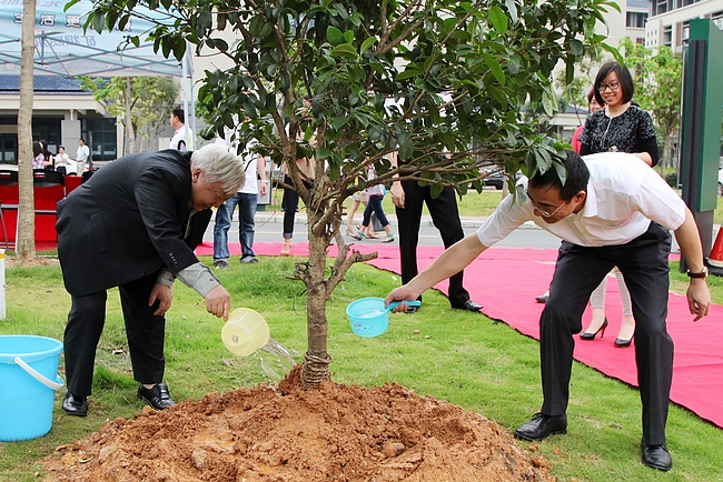 在参观了新校区校园后,周远清会长还来到位于荔香苑前的“桂园”,和陪同访问的东莞理工学院原教务长林养素一同飞锹培土,浇水灌溉,亲自种下了一颗芳香四溢、生机勃勃的桂花树,并现场亲笔签名以示纪念。